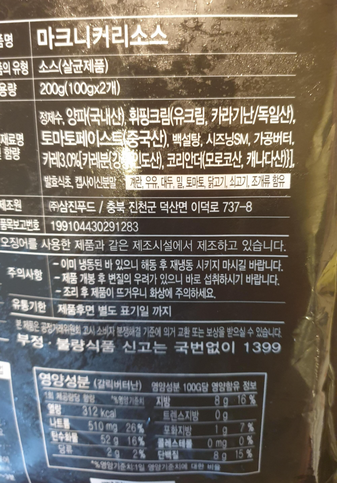 | 원재료명 및 함량 | 정제수, 양파(국내산), 휘핑크림(유크림, 카라기난/독일산) 토마토페이스트(중국산), 백설탕, 시즈닝SM, 가공버터, 카페 3.0%[카레분{강황(인도산), 코리안더(모로코산, 캐나다산)}] 발효식초, 캡사이신분말 |