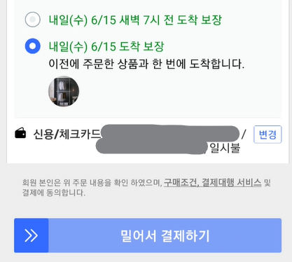 구매하기 버튼을 눌러서 구매 확정하는 화면으로 이동합니다. 상품과 가격 및 수량 정보 그리고 배송 예정일과 결제 수단 등을 확인하고 하단의 밀어서 결제하기 슬라이드를 우측으로 밀면 바로 결제가 완료됩니다.