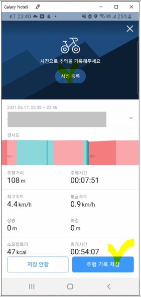주행 종료 버튼을 클릭하고 자전거 주행을 종료하고자 할 경우, 사진 등록 기능이 있어 사진으로 추억을 기록해둘 수도 있습니다.