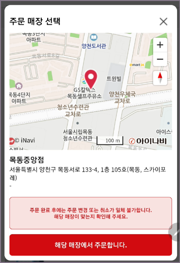 이제 주문 아이콘을 눌러서 매머드커피를 주문하기 위해서는 먼저 주문할 매장을 선택하시면 됩니다. 위치가 가까운 지점부터 표시되기 때문에 매장명으로 헷갈리시는 경우는 해당 매장을 눌러서 위치 정보까지 확인한 다음 '해당 매장에서 주문합니다.'를 다시 눌러주시면 됩니다.